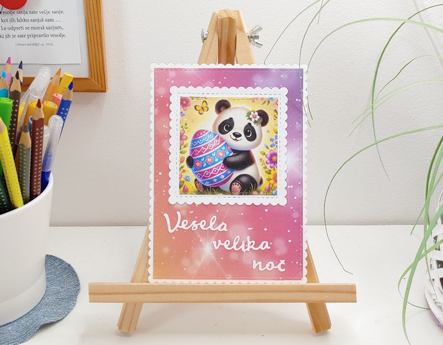 Ročno izdelana unikatna Piki Kitty voščilnica je sestavljena iz dveh slojev barvnega oz. vzorčnega papirja debeline ca. 250 gr. Osrednji motiv je prijazna panda s pisanim pirhom v naročju.