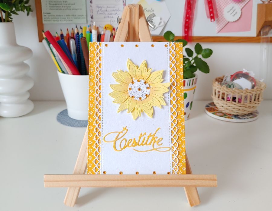 Ročno izdelana unikatna Piki Kitty voščilnica je sestavljena iz dveh slojev papirja debeline ca. 200 gr., pri čemer je prvi sloj iz vzorčnega papirja, drugi sloj pa je bel z drobno izrezljanim robom. Osrednji motiv voščilnice je ročno pobarvan fantazijski cvet v živahni rumeni barvi. Voščilnico ima eleganten napis “Čestitke”.