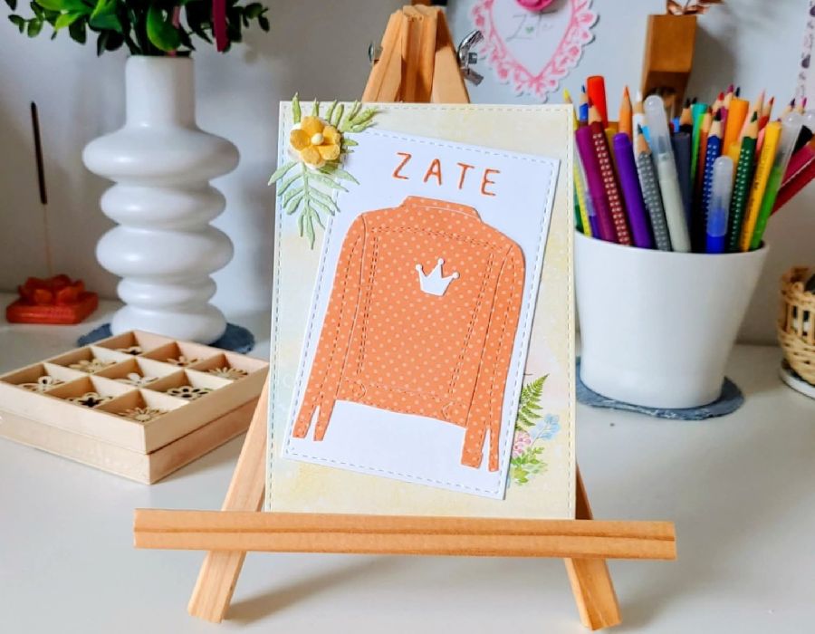 Ročno izdelana unikatna Piki Kitty čestitka je sestavljena iz dveh slojev papirja, pri čemer je prvi sloj iz nežno rumenega papirja debeline ca. 300 gr, druga plast pa je popolnoma bela. Osrednji motiv je jeans jakna v oranžni barvi. Nad jakno kraljuje napis “zate”. Levo zgoraj pa se nahaja droben rumen cvet, ki poživi celotno čestitko.
